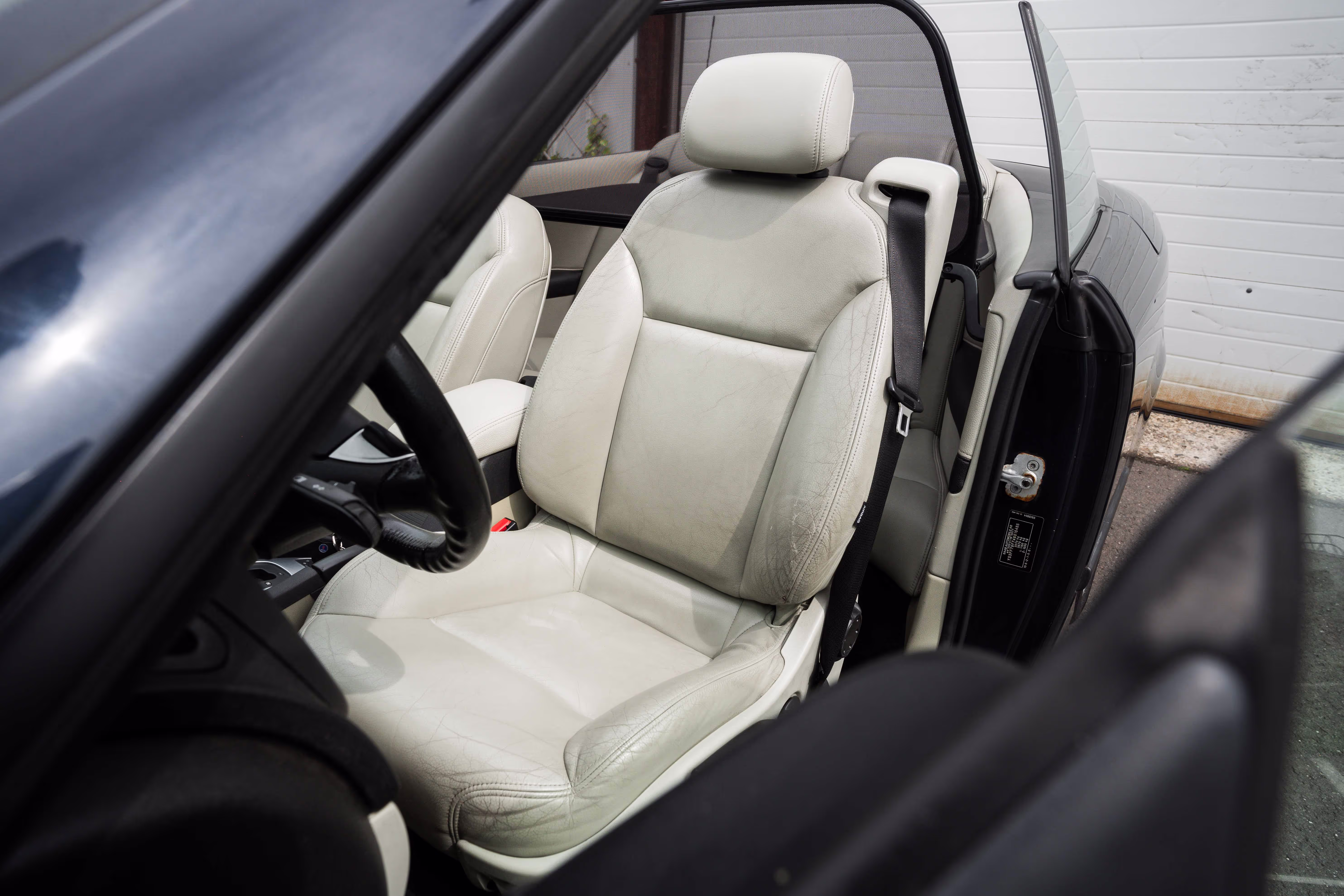 De lak is nog grotendeels origineel, daardoor is hier en daar een krasje te zien en is er wat steenslag op de motorkap. Maar over het algemeen is het Nocturnal Blue lakwerk een erg mooie verschijning om te zien en is heel wat anders dan het saaie grijs of zwart waarin de cabrio's ook verkrijgbaar waren.